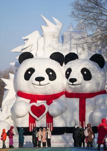 (250113) -- BORTALA, 13 enero, 2025 (Xinhua) -- Turistas caminan en la superficie congelada del lago Sayram al atardecer, en...