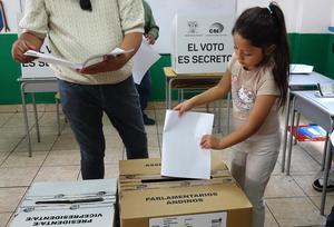 (250209) -- TUMBACO, 9 febrero, 2025 (Xinhua) -- Una niña coloca un voto en una urna electoral durante las elecciones...