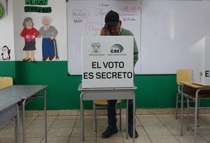 (250209) -- TUMBACO, 9 febrero, 2025 (Xinhua) -- Un hombre emite su voto en un colegio electoral durante las elecciones...