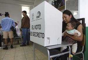 (250209) -- TUMBACO, 9 febrero, 2025 (Xinhua) -- Una mujer emite su voto en un colegio electoral durante las elecciones...