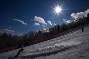 (250209) -- YABULI, 9 febrero, 2025 (Xinhua) -- Pattarapol Saengdaeng, de Tailandia, compite durante el eslalon masculino de esquí alpino...