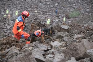(250209) -- JUNLIAN, 9 febrero, 2025 (Xinhua) -- Un rescatista, con la ayuda de un perro rastreador, busca personas desaparecidas,...