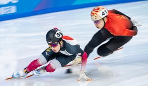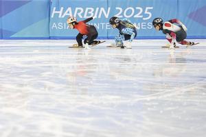 (250207) -- HARBIN, 7 febrero, 2025 (Xinhua) -- Saito Shun (i), de Japón, compite durante la prueba de cuartos de...