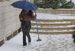(250207) -- SAWFAR, 7 febrero, 2025 (Xinhua) -- Una mujer camina bajo la nieve, en el poblado de Sawfar, en...