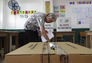 (250209) -- QUITO, 9 febrero, 2025 (Xinhua) -- Una mujer emite su voto en un colegio electoral, en la ciudad...