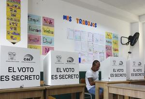 (250209) -- TUMBACO, 9 febrero, 2025 (Xinhua) -- Un hombre emite su voto en un colegio electoral durante las elecciones...