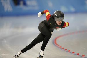 (250209) -- HARBIN, 9 febrero, 2025 (Xinhua) -- Han Mei, de China, compite durante el esprint femenino por equipos de...