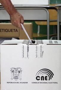 (250209) -- TUMBACO, 9 febrero, 2025 (Xinhua) -- Un hombre coloca su voto en una urna electoral durante las elecciones...