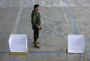 (250209) -- CUMBAYÁ, 9 febrero, 2025 (Xinhua) -- Un militar vigila casillas electorales durante las elecciones generales, en Cumbayá, en...