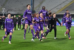 (250207) -- FLORENCIA, 7 febrero, 2025 (Xinhua) -- Imagen del 6 de febrero de 2025 de jugadores de Fiorentina festejando...