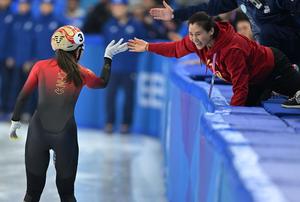 (250209) -- HARBIN, 9 febrero, 2025 (Xinhua) -- Gong Li (i), de China, festeja con su entrenadora, Zhang Jing, al...