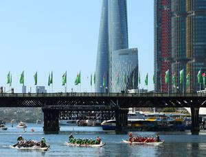 (250207) -- SIDNEY, 7 febrero, 2025 (Xinhua) -- Concursantes participan en una carrera de bote del dragón, en el Puerto...