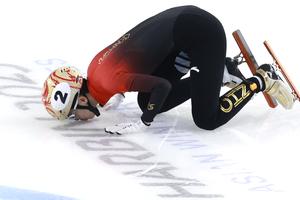 (250209) -- HARBIN, 9 febrero, 2025 (Xinhua) -- Fan Kexin, de China, besa el hielo al término de la prueba...