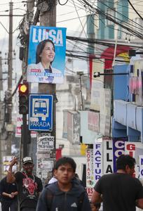 (250206) -- QUITO, 6 febrero, 2025 (Xinhua) -- Personas caminan frente a un cartel anunciando a la candidata a la...