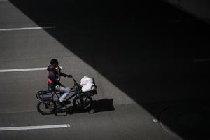 (250206) -- BOGOTA, 6 febrero, 2025 (Xinhua) -- Un hombre circula en bicicleta por una avenida durante una nueva jornada...