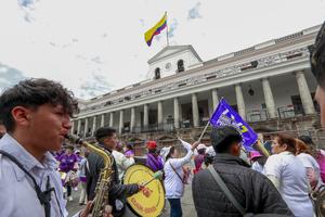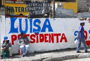 (250206) -- QUITO, 6 febrero, 2025 (Xinhua) -- Personas son vistas frente a un mural anunciando a la candidata a...