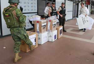 (250206) -- QUITO, 6 febrero, 2025 (Xinhua) -- Elementos de las fuerzas de seguridad resguardan urnas que contienen papeletas de...