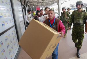 (250206) -- QUITO, 6 febrero, 2025 (Xinhua) -- Un integrante del Consejo Nacional Electoral transporta una urna que contiene papeletas...