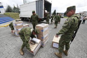 (250208) -- QUITO, 8 febrero, 2025 (Xinhua) -- Militares descargan cajas con urnas y papeletas electorales previo a las elecciones...