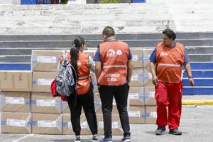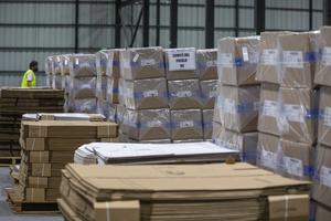 (250208) -- QUITO, 8 febrero, 2025 (Xinhua) -- Trabajadores del Consejo Nacional Electoral observan cajas con urnas y papeletas electorales...