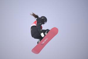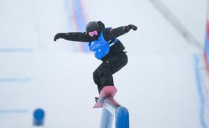 (250208) -- YABULI, 8 febrero, 2025 (Xinhua) -- Jiang Xinjie, de China, compite durante la final de slopestyle de snowboard...