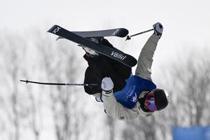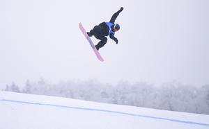 (250208) -- YABULI, 8 febrero, 2025 (Xinhua) -- Liu Haoyu, de China, compite durante la final de slopestyle de snowboard...