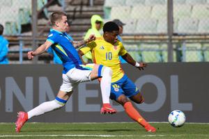 (250207) -- CARACAS, 7 febrero, 2025 (Xinhua) -- El jugador Oscar Perea (d), de Colombia, disputa el balón con Igor Schlemper (i), de Brasil, durante el partido correspondiente a la segunda fecha de la fase final del torneo Sudamericano Sub-20 de la Confederación Sudamericana de Fútbol (Conmebol), celebrado en el Estadio Olímpico de la Universidad Central de Venezuela, en Caracas, Venezuela, el 7 de febrero de 2025. (Xinhua/Marcos Salgado) (ms) (rtg) (ra) (vf)