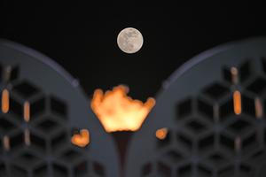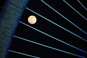 (250212) -- HARBIN, 12 febrero, 2025 (Xinhua) -- La luna es vista sobre el pebetero de los IX Juegos Asiáticos...