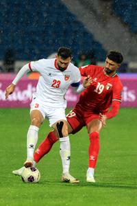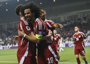 (250321) -- DOHA, 21 marzo, 2025 (Xinhua) -- Imagen del 20 de marzo de 2025 de Akram Afif (d), de...
