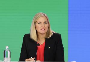 (250321) -- COSTA NAVARINO, 21 marzo, 2025 (Xinhua) -- Kirsty Coventry, recién elegida presidenta del Comité Olímpico Internacional (COI), habla...
