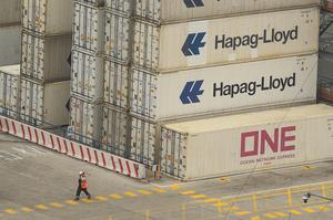 (250321) -- VALPARAISO, 21 marzo, 2025 (Xinhua) -- Un trabajador portuario camina frente a contenedores apilados en el Puerto de...