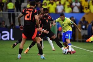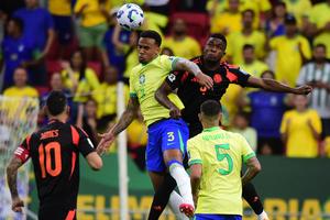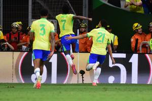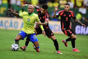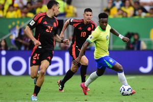 (250321) -- BRASILIA, 21 marzo, 2025 (Xinhua) -- Imagen del 20 de marzo de 2025 de Vinicius Junior (d), de...