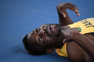(250321) -- NANJING, 21 marzo, 2025 (Xinhua) -- Rusheen Mcdonald, de Jamaica, reacciona al término de las eliminatorias de 400m...
