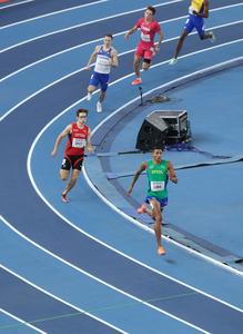 (250321) -- NANJING, 21 marzo, 2025 (Xinhua) -- Matheus Lima (d-abajo), de Brasil, compite durante las eliminatorias de 400m masculinos...