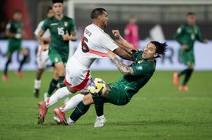 (250321) -- LIMA, 21 marzo, 2025 (Xinhua) -- Imagen del 20 de marzo de 2025 de Miguel Trauco (d), de...