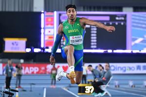 (250321) -- NANJING, 21 marzo, 2025 (Xinhua) -- Almir Dos Santos, de Brasil, compite durante la final de triple salto...