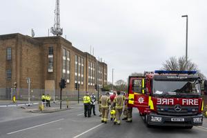 (250321) -- LONDRES, 21 marzo, 2025 (Xinhua) -- Bomberos trabajan afuera de una subestación eléctrica que sufrió un incendio cerca...