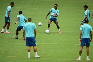 (250324) -- BRASILIA, 24 marzo, 2025 (Xinhua) -- El jugador, Vinicius Júnior (c-arriba), de la selección nacional de fútbol de Brasil, participa en una sesión de entrenamiento previo al partido de las Eliminatorias para la Copa Mundial de la FIFA 2026 ante Argentina, en el Estadio Mané Garrincha, en Brasilia, Brasil, el 24 de marzo de 2025. (Xinhua/Lucio Tavora) (lt) (rtg) (ah) (ce)