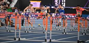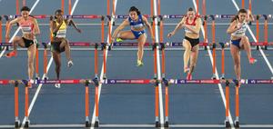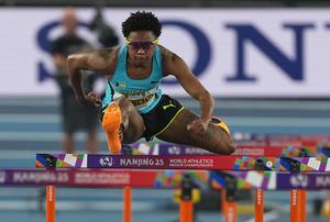 (250323) -- NANJING, 23 marzo, 2025 (Xinhua) -- Devynne Charlton, de Bahamas, compite durante la final de 60m vallas femenino...