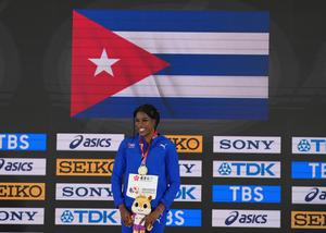 (250323) -- NANJING, 23 marzo, 2025 (Xinhua) -- La medallista de oro Leyanis Pérez Hernández, de Cuba, reacciona durante la...