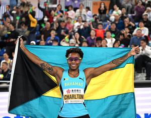 (250323) -- NANJING, 23 marzo, 2025 (Xinhua) -- Devynne Charlton, de Bahamas, reacciona después de la final de 60m vallas...
