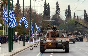 (250325) -- ATENAS, 25 marzo, 2025 (Xinhua) -- Vehículos militares son vistos durante un desfile militar en conmemoración del Día...