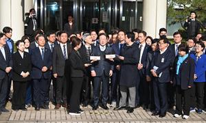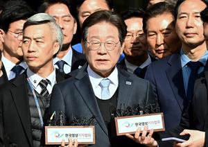 (250326) -- SEUL, 26 marzo, 2025 (Xinhua) -- Lee Jae-myung (c) habla tras ser absuelto del cargo de violación de...