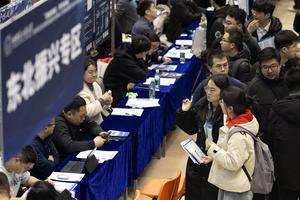(250326) -- HARBIN, 26 marzo, 2025 (Xinhua) -- Estudiantes conocen sobre la información laboral en una feria de empleo celebrada...