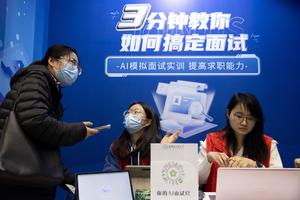 (250326) -- HARBIN, 26 marzo, 2025 (Xinhua) -- Una estudiante conoce sobre la entrevista con IA en una feria de...