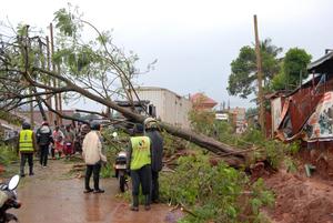 (250326) -- KAMPALA, 26 marzo, 2025 (Xinhua) -- Personas limpian una calle bloqueada por un árbol caído, en Kampala, capital...
