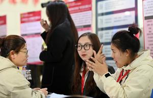 (250326) -- TIANJIN, 26 marzo, 2025 (Xinhua) -- Una solicitante de trabajo con discapacidad (i) conversa con un reclutador durante...