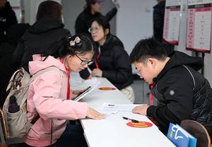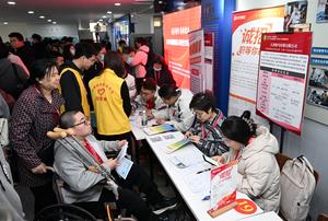 (250326) -- TIANJIN, 26 marzo, 2025 (Xinhua) -- Un solicitante de trabajo con discapacidad conoce sobre la información de reclutamiento...