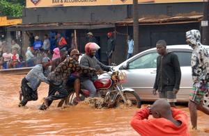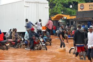 (250326) -- KAMPALA, 26 marzo, 2025 (Xinhua) -- Personas vadean una calle inundada, en Kampala, capital de Uganda, el 26...
