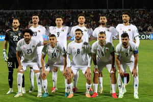 (250326) -- AMAN, 26 marzo, 2025 (Xinhua) -- Imagen del 25 de marzo de 2025 de jugadores de Palestina, posando...